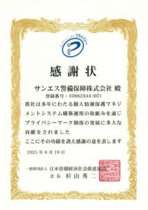 感謝状をいただきました 2025.10.30 個人情報保護マネジメントシステムの長年にわたる取組に関しまして 一般社団法人 日本情報経済社会推進協会様より感謝状をいただきました。 今後とも引き続き個人情報保護の取組強化を図ってまいります。